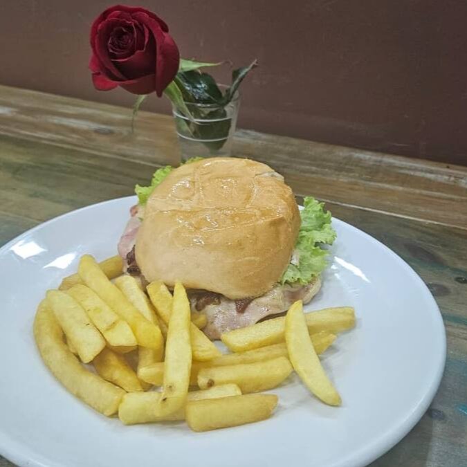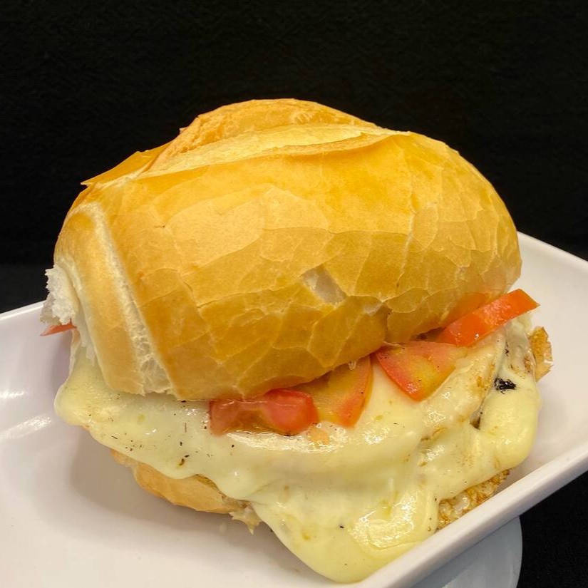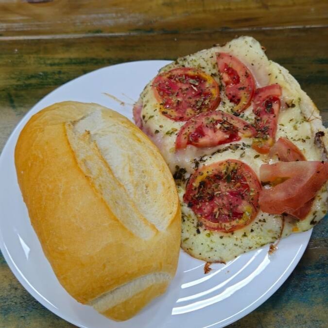 Pão francês crocante recheado com queijo, presunto, tomate e orégano.