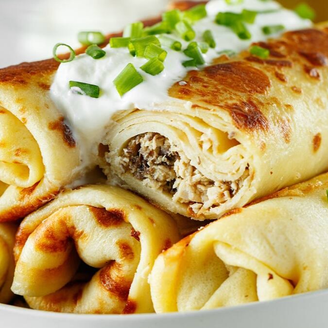 Panqueca De Frango E Alho Poró Com Molho Branco