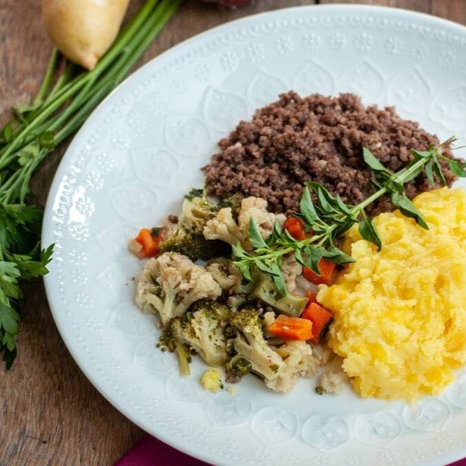 Purê De Mandioquinha, Legumes E Carne Moída Refogada