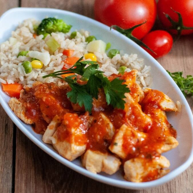 Cubos De Frango Ao Sugo E Arroz Primavera