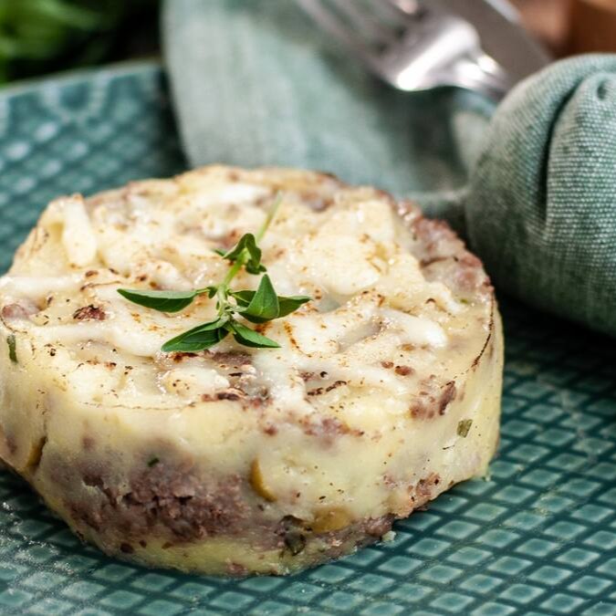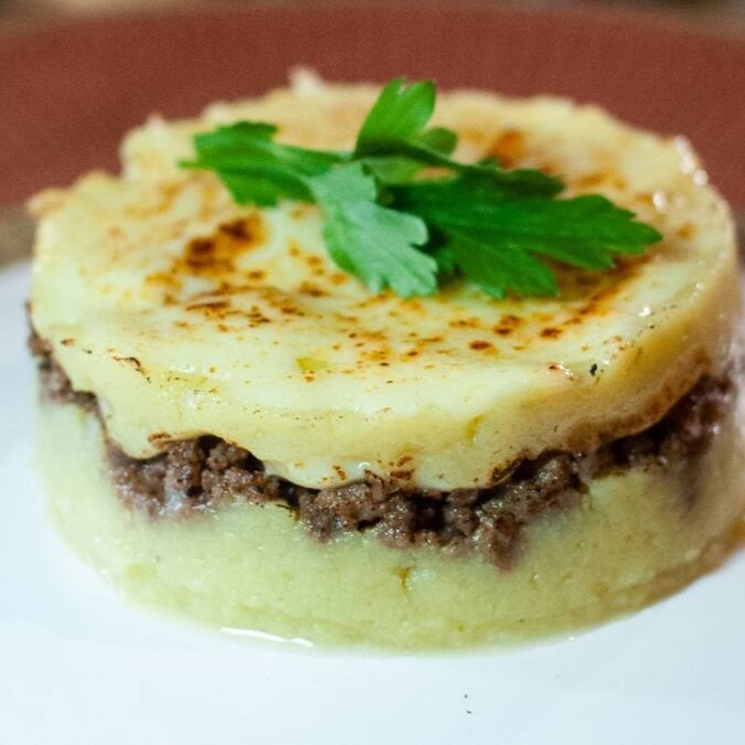 Purê de batata, carne moída com azeitonas e ovos cozidos.