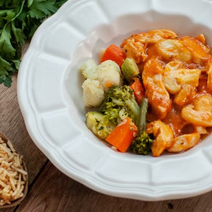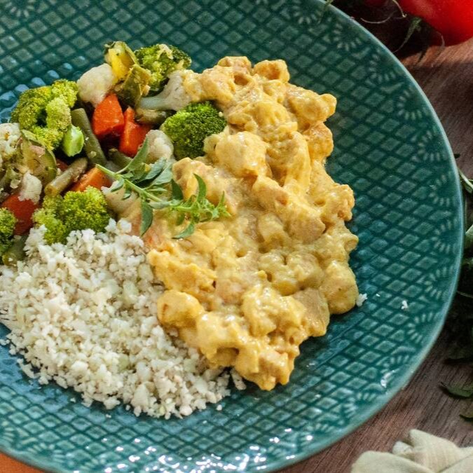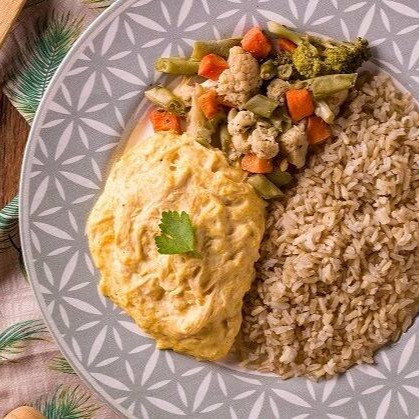 Ingredientes: Frango desfiado, milho verde, creme de leite, sal rosa, azeite de oliva, cebola, alho, arroz integral, abobrinha, couve flor, cenoura, brócolis, vagem, pimenta em pó e ervas desidratadas.