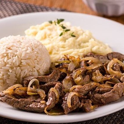 Tiras De Alcatra Acebolada, Arroz Bco, Feijão Bco E Purê De Batata