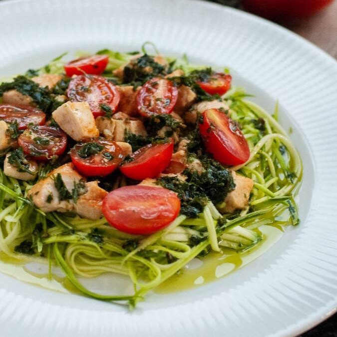 Spaghetti De Abobrinha Ao Pesto Com Frango