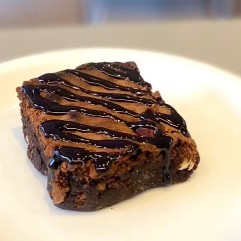 Brownie de chocolate com aquele toque crocante de avelãs ou nozes, coberto com uma leve calda de chocolate. Peso aproximado de 80g.