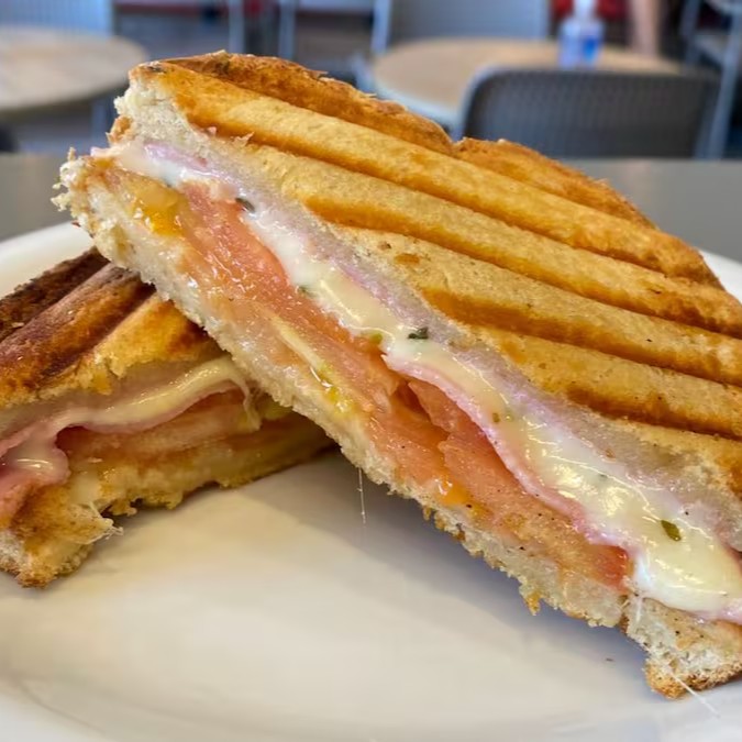 Pão de forma, presunto, queijo mussarela, orégano e tomate, tostado com manteiga.