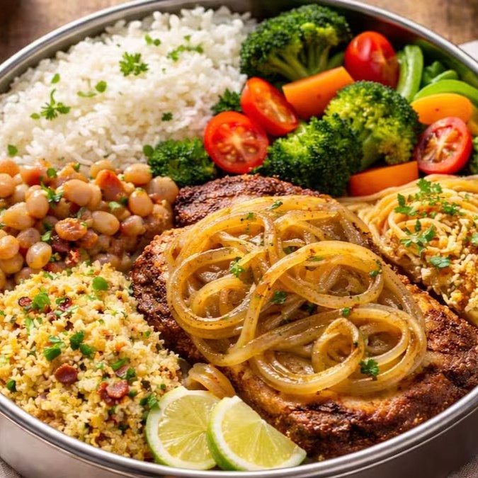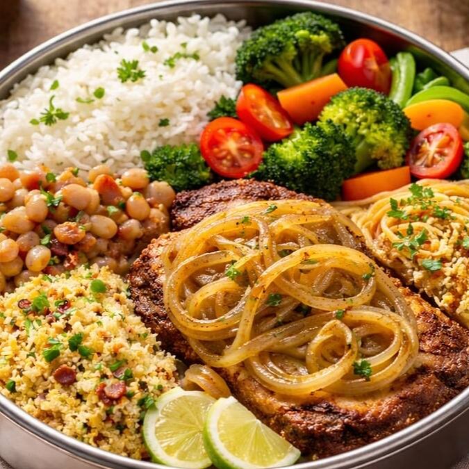 Tamanho P: Arroz soltinho, feijão branco, macarrão, legumes do Dia e farofa.