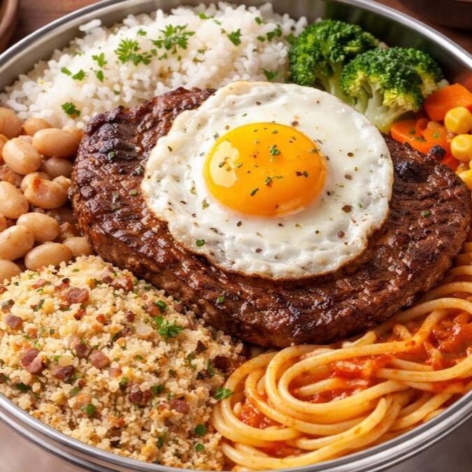 Tamanho P: Arroz soltinho, feijão branco, macarrão, legumes do Dia, farofa.