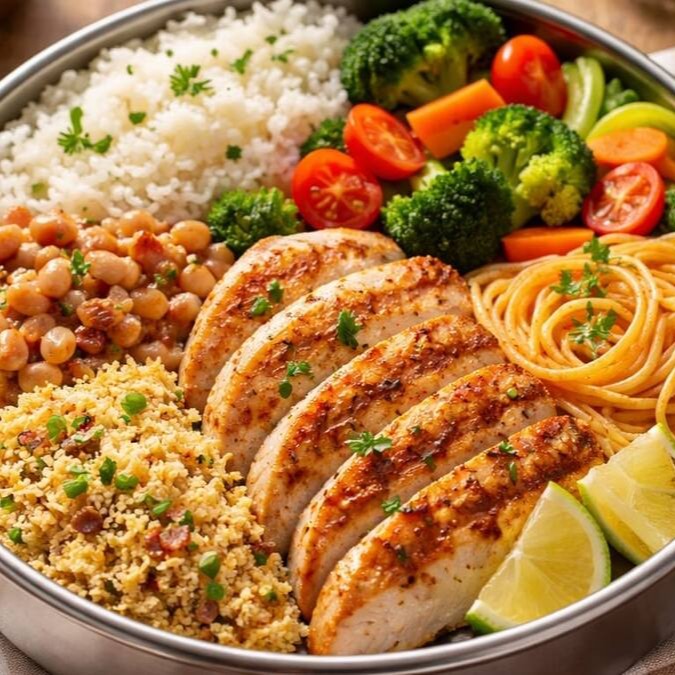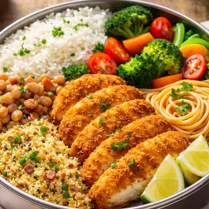 Arroz branco soltinho, feijão branco delicioso, farofa, macarrão, legumes do Dia e frango empanado.