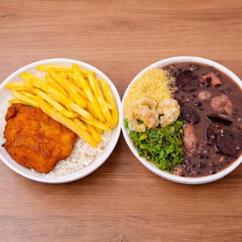 Feijoada, Calabresa Defumada, Mignon Suino, Couve, Torresmo, Farofa e Arroz.