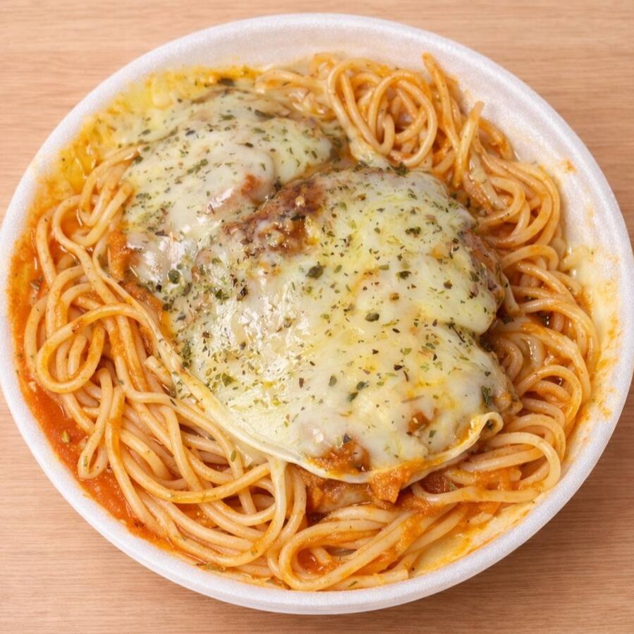 Macarrão ao Molho, Filé de Frango empanado, Molho Artesanal e Queijo com Orégano.