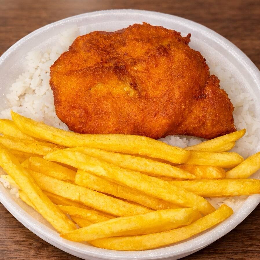 Filé de Frango Empanado, Fe.ijão Branco, Batata Frita e Arroz