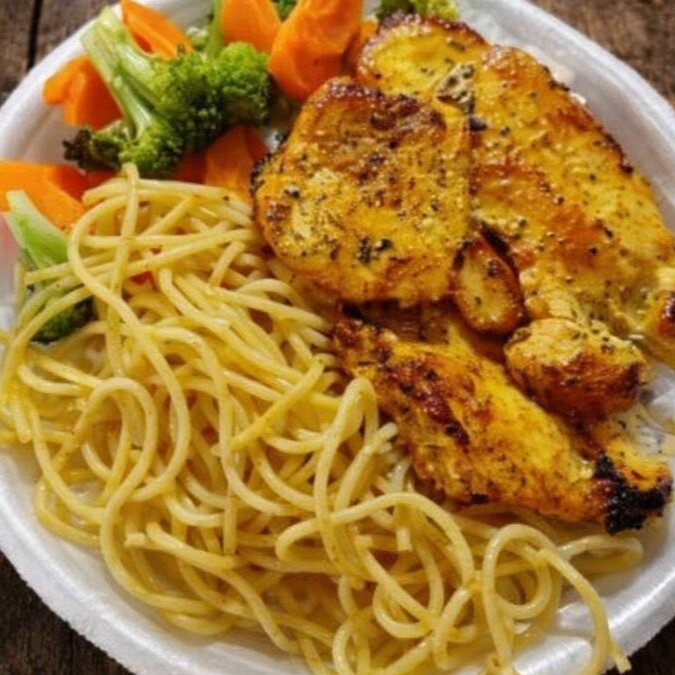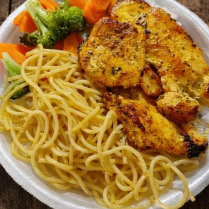 Nessa deliciosa marmita vem, arroz soltinho, feijão bem temperado, macarrão alho e óleo, legumes refogados, farofa e Filé de Frango Grelhado.