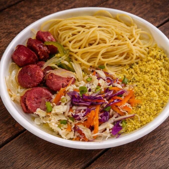Nessa deliciosa marmita vem arroz soltinho, feijão bem temperado, macarrão alho e óleo, refogado de legumes, farofa e linguiça toscana.