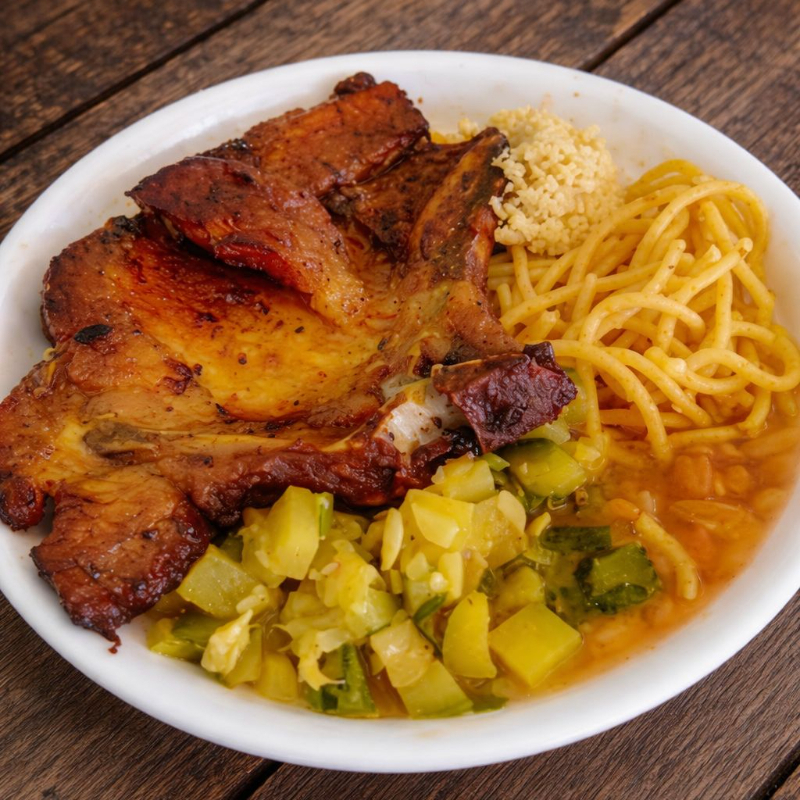 Marmita tamanho G, vem arroz soltinho. feijão bem temperado, macarrão alho e óleo, legumes refogados, farofa e Bisteca