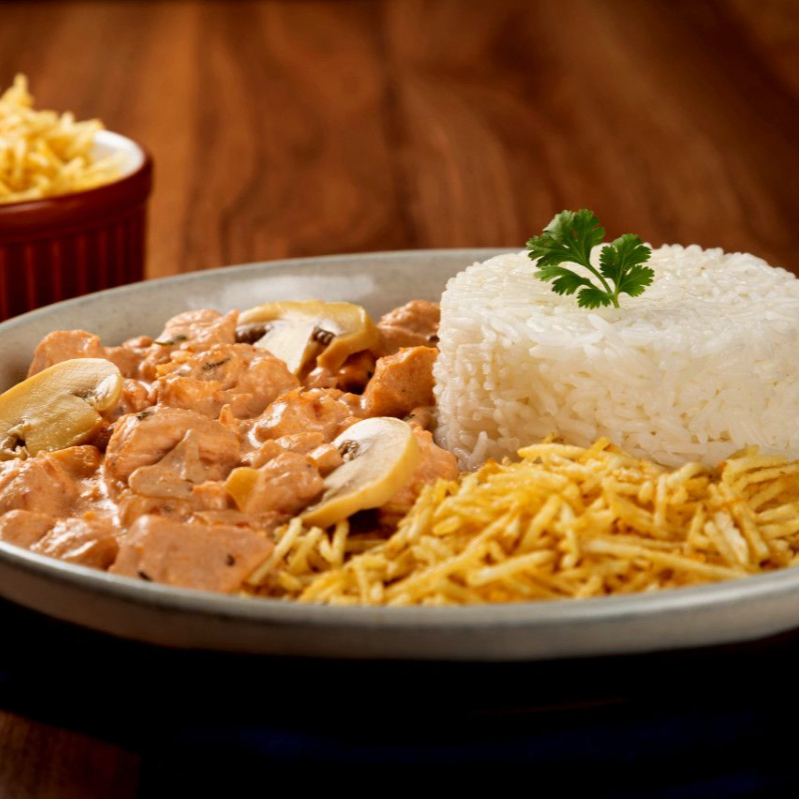 Clássico e irresistível! Delicioso frango em tiras grelhadas 200g , envolvido em um cremoso molho de strogonoff com champignons ou sem como você preferir , acompanhado de arroz soltinho 300g e crocantes batatas palha/fritas . Uma refeição completa que une sabor, tradição e praticidade.
