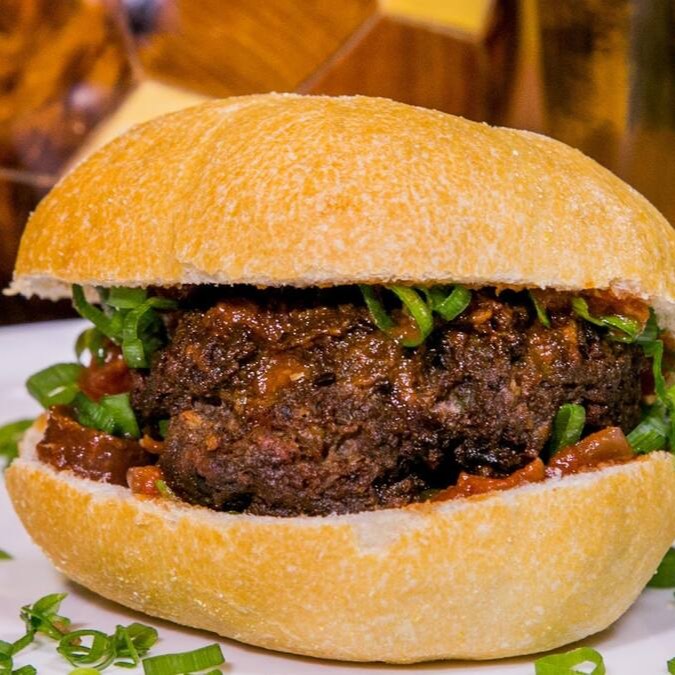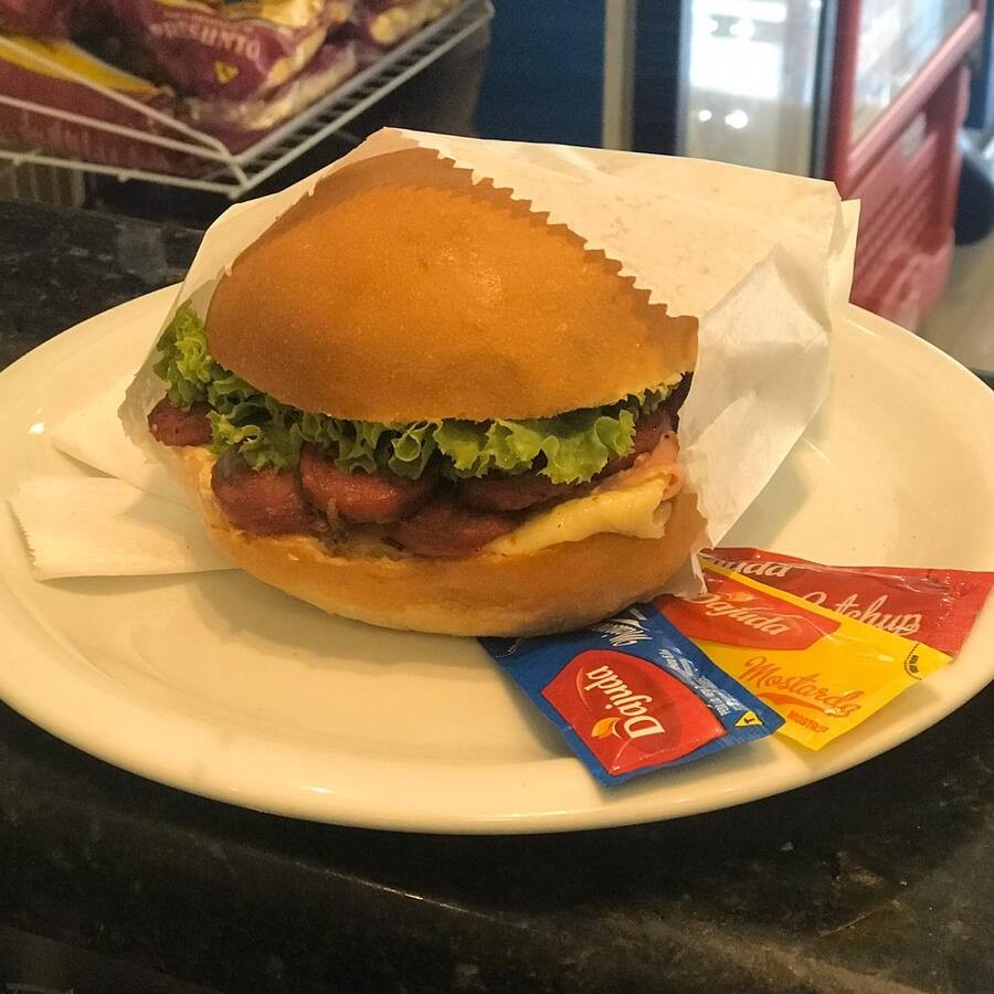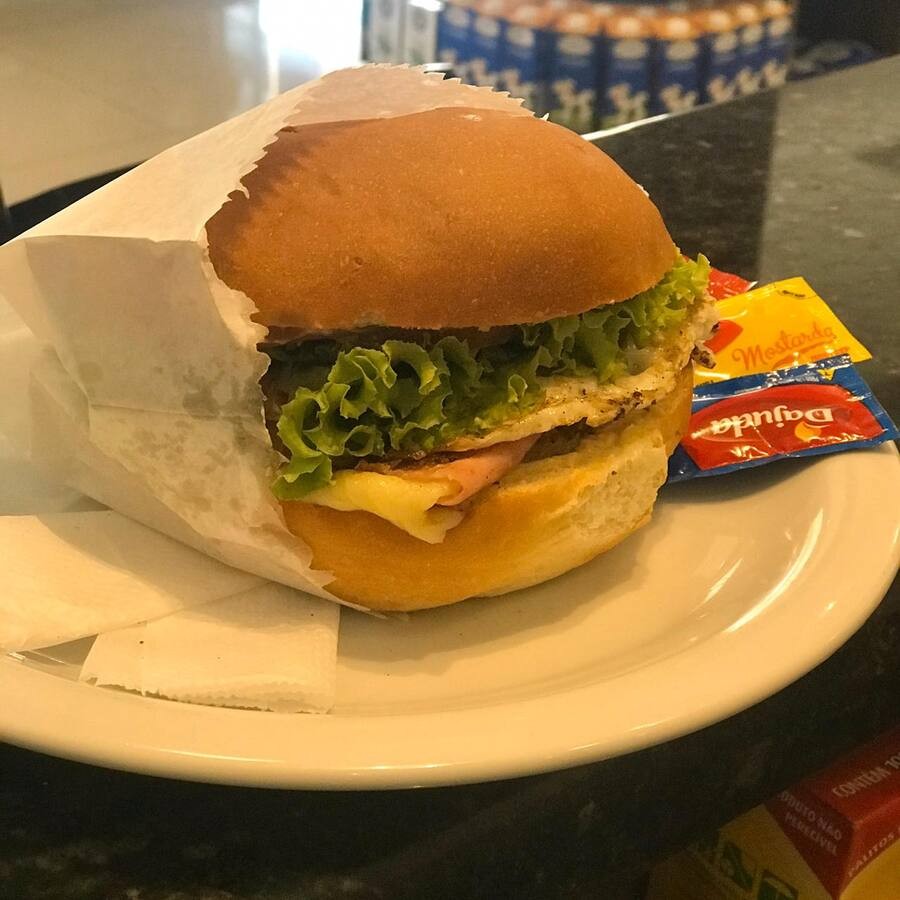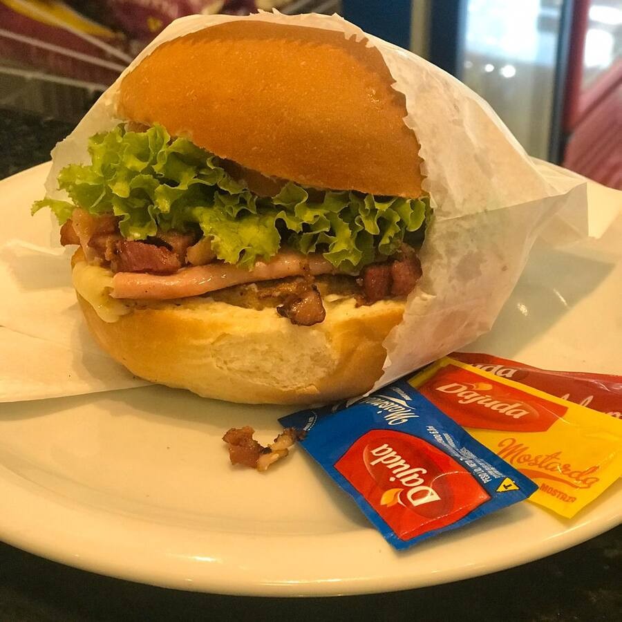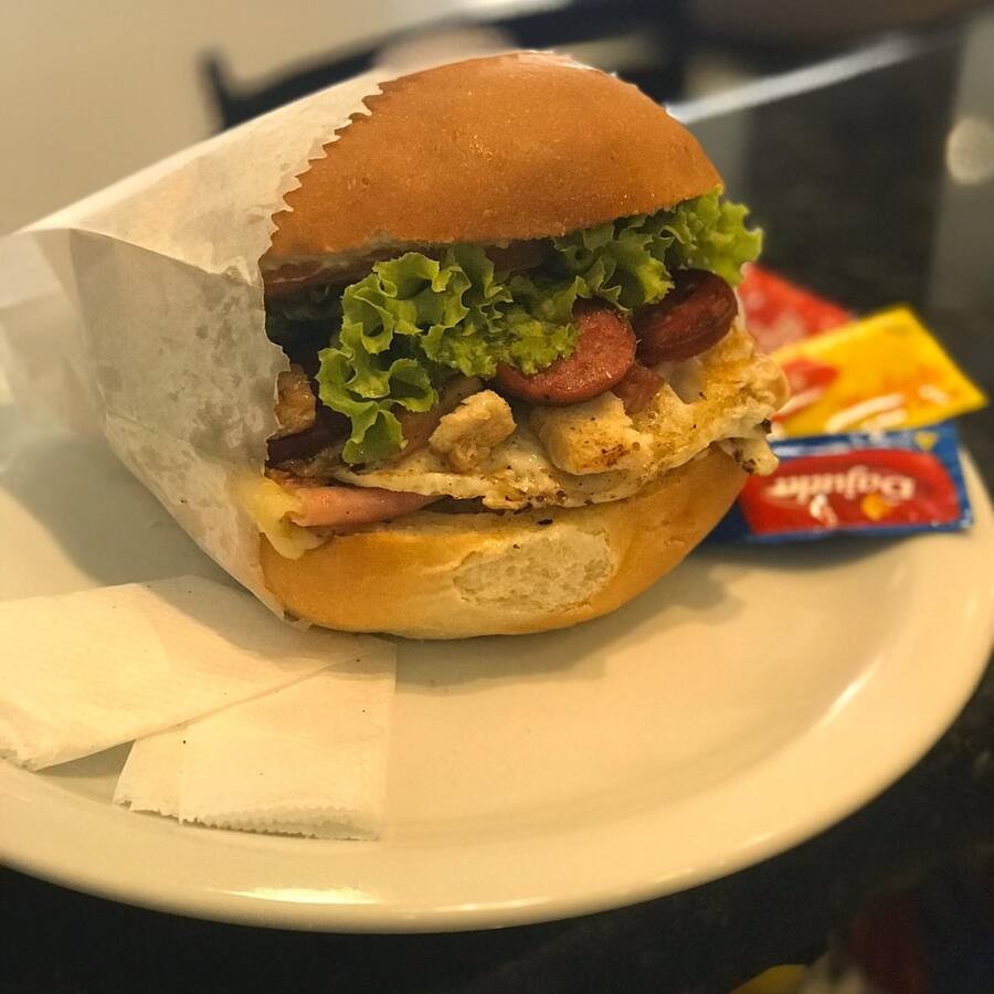 Pão, hambúrguer, frango, bacon e ovo maionese, calabresa, queijo, presunto, alface e tomate.