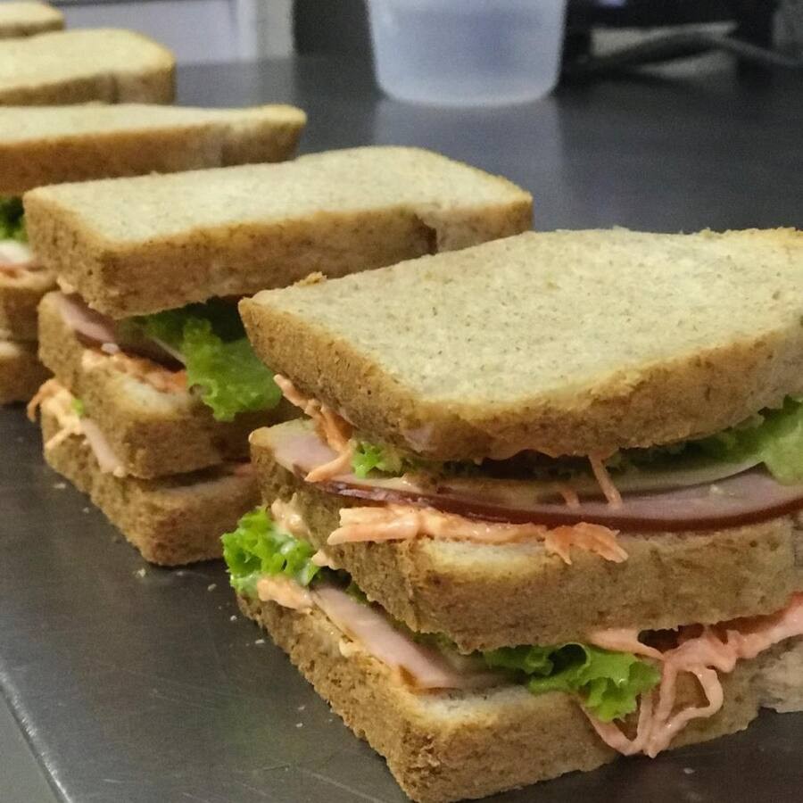 Pão integral fatiado, maionese 0% gorduras, alface, cenoura, tomate, queijo e presunto.