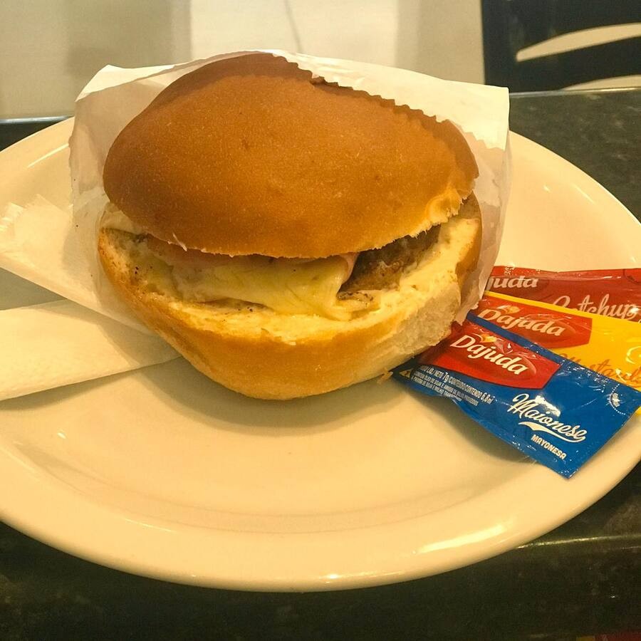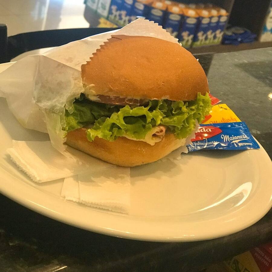 Pão, hambúrguer, maionese, queijo e presunto, alface e tomate.