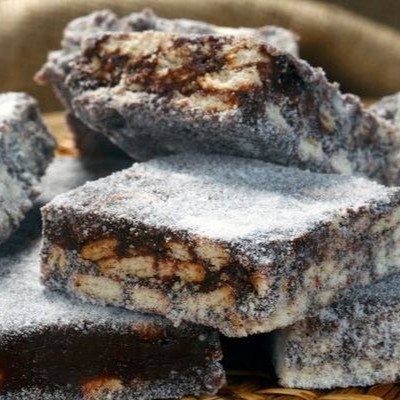 Leite condensado, biscoito maisena, chocolate em pó, margarina e açúcar.
