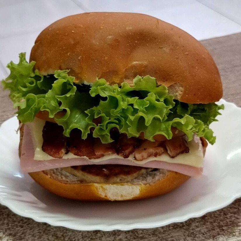 Pão, hambúrguer, bacon, maionese, queijo e presunto, alface e tomate
