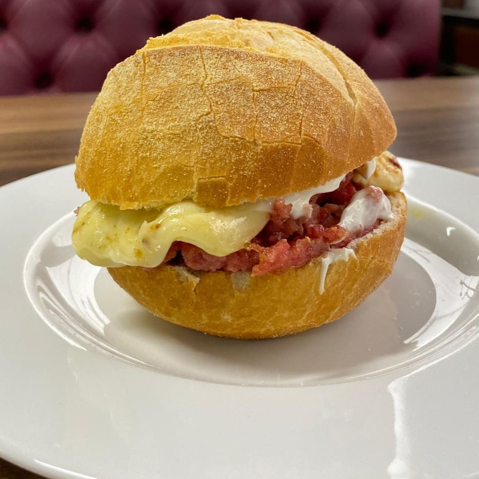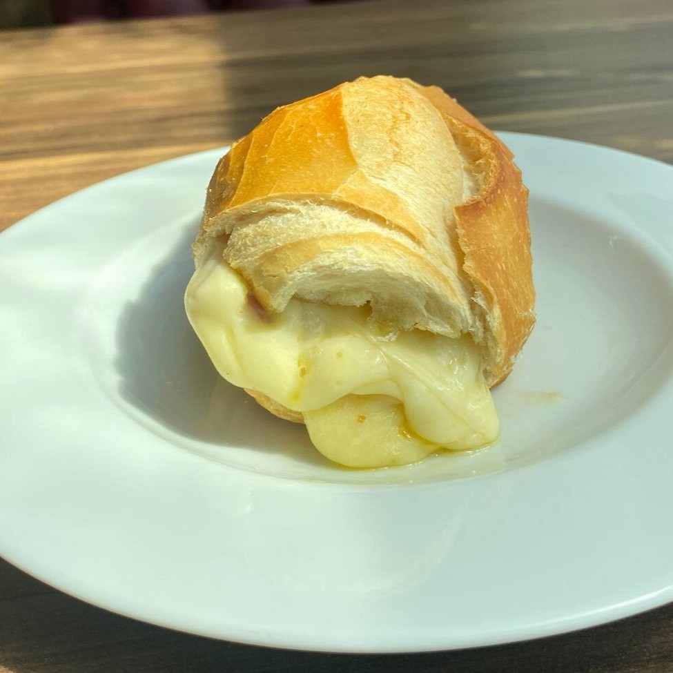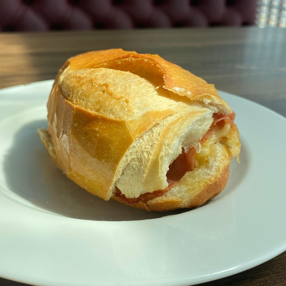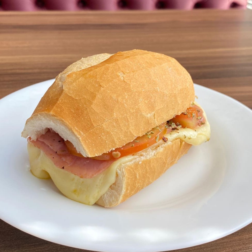Pão francês, duas fatias de queijo, duas fatias da carne escolhida (presunto, mortadela ou peito de peru), pão francês e manteiga, tudo na chapa!