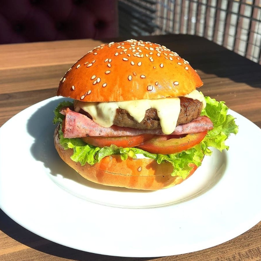 Pão de hambúrguer da casa, maionese, queijo, presunto, hambúrguer de 140g mais a sua opção.