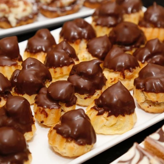 Massa choux recheada com doce de leite e coberto com chocolate.