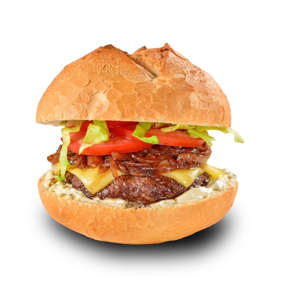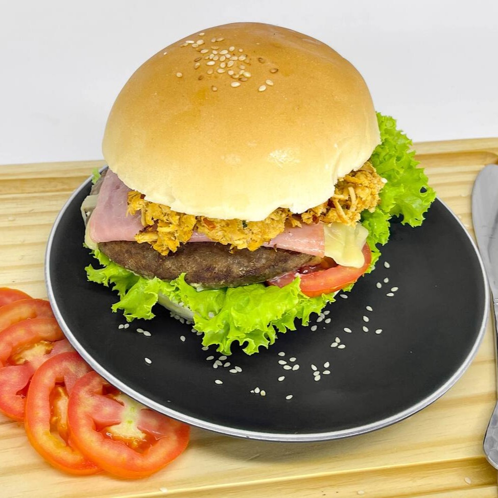 Pão de hambúrguer, maionese, hambúrguer, frango desfiado, presunto, muçarela, alface e tomate.