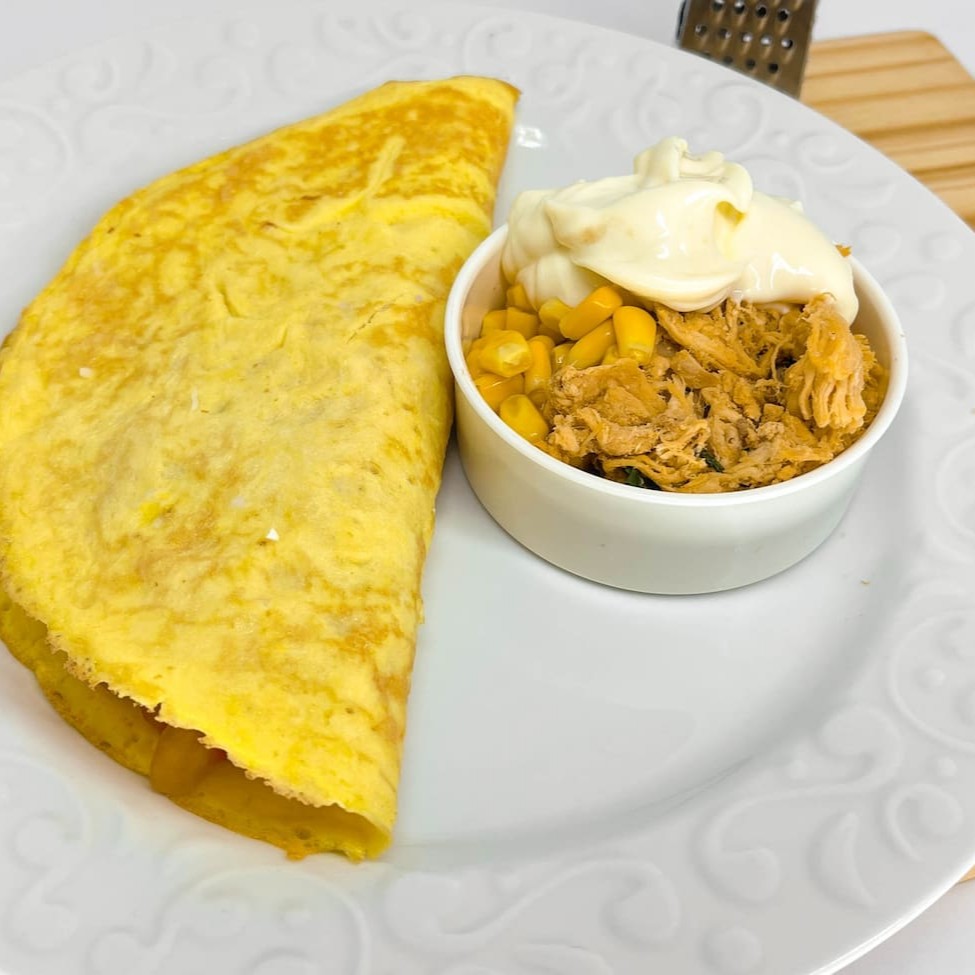 Frango desfiado temperado, milho e requeijão ou muçarela.
