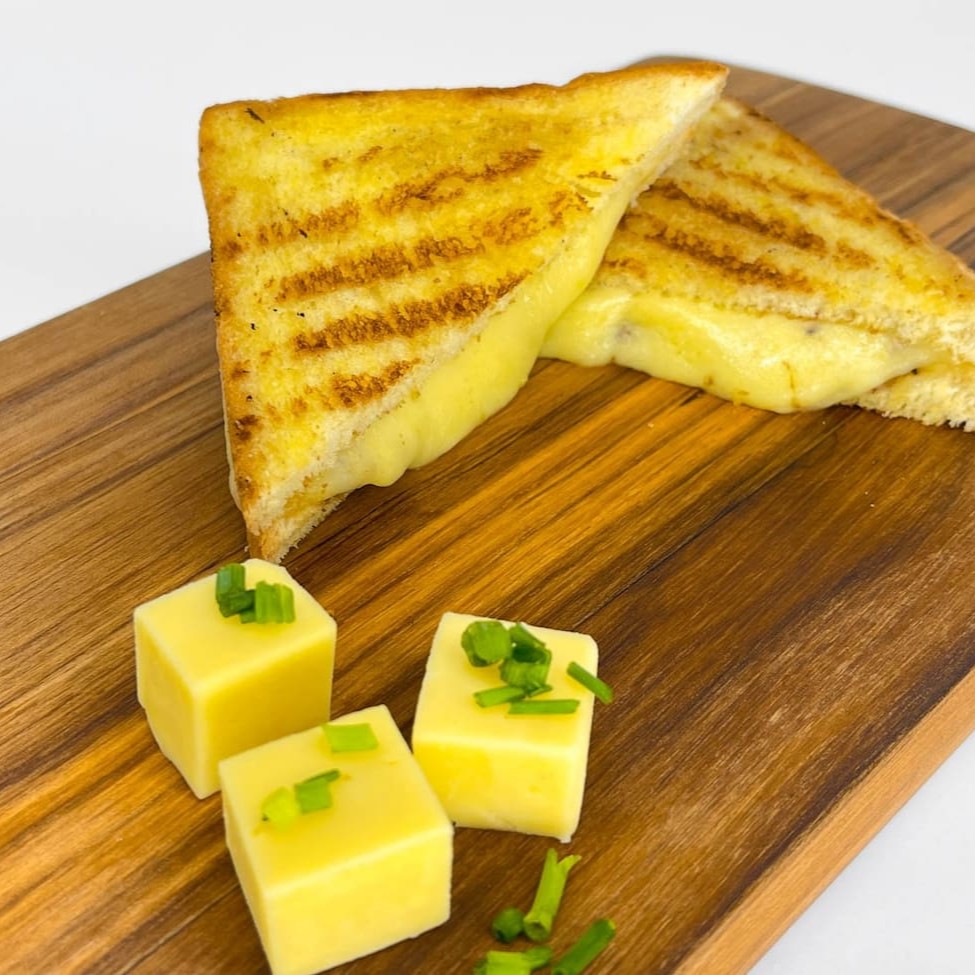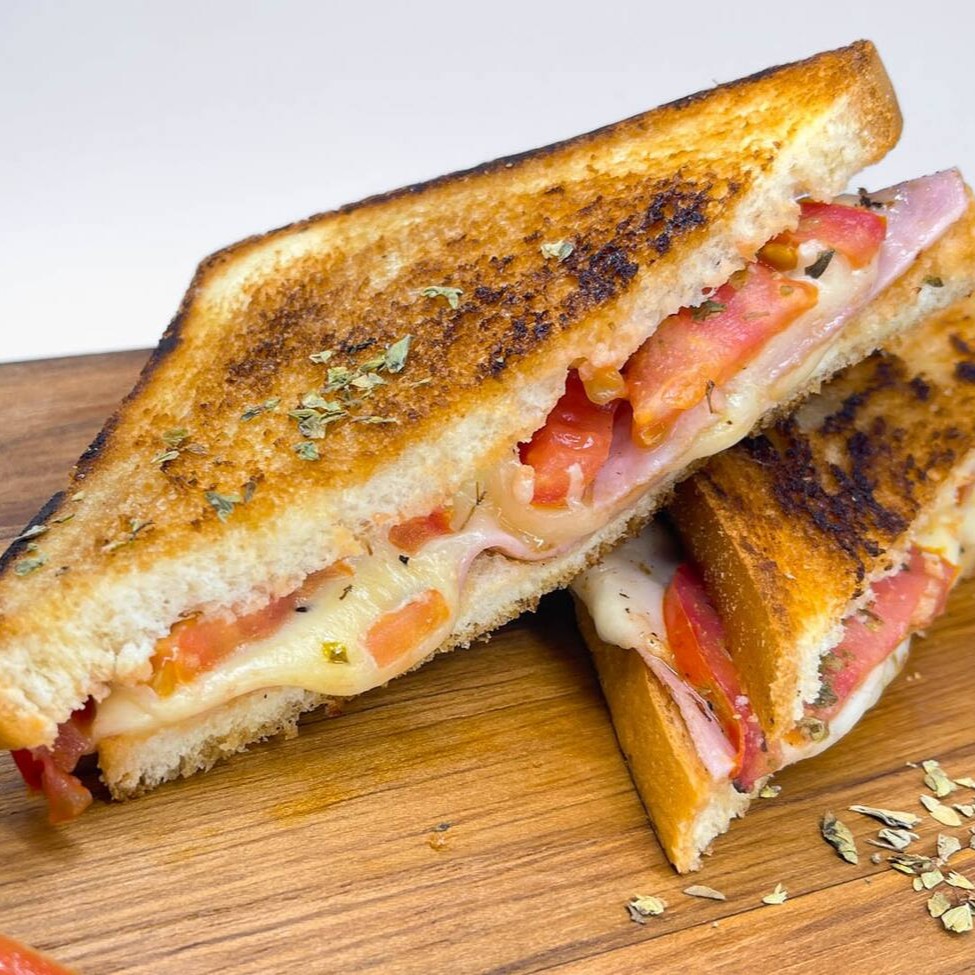 Pão de sanduíche intercalado com presunto e queijo asiago, gratinado com molho alfredo.