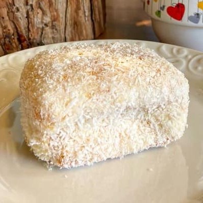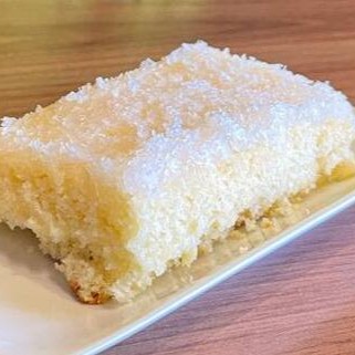 Massa especial com côco ralado, recheado com creme chiffon umedecida e coberto com calda de côco