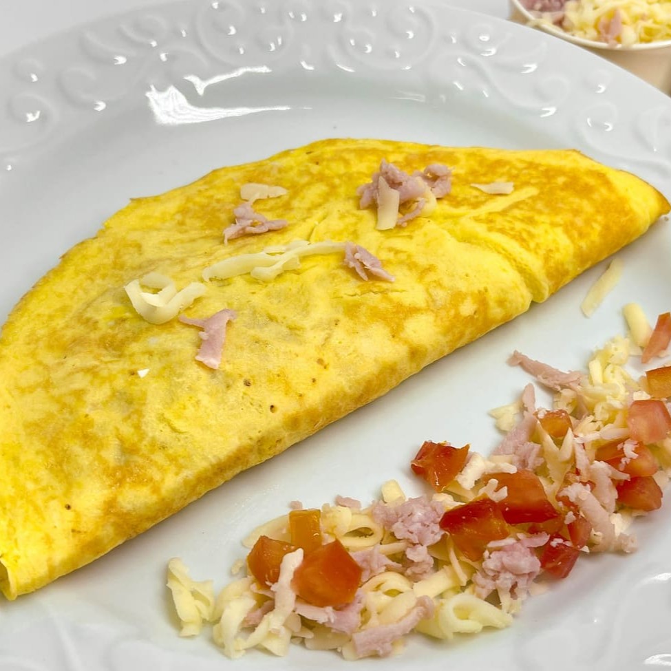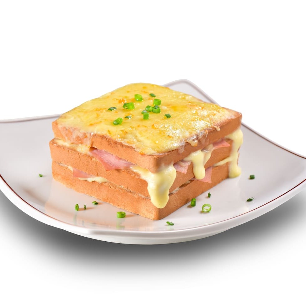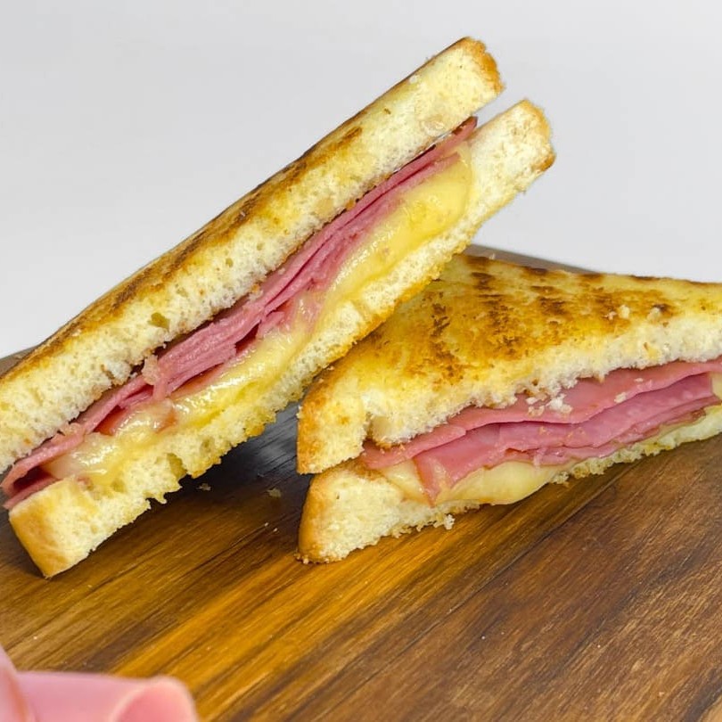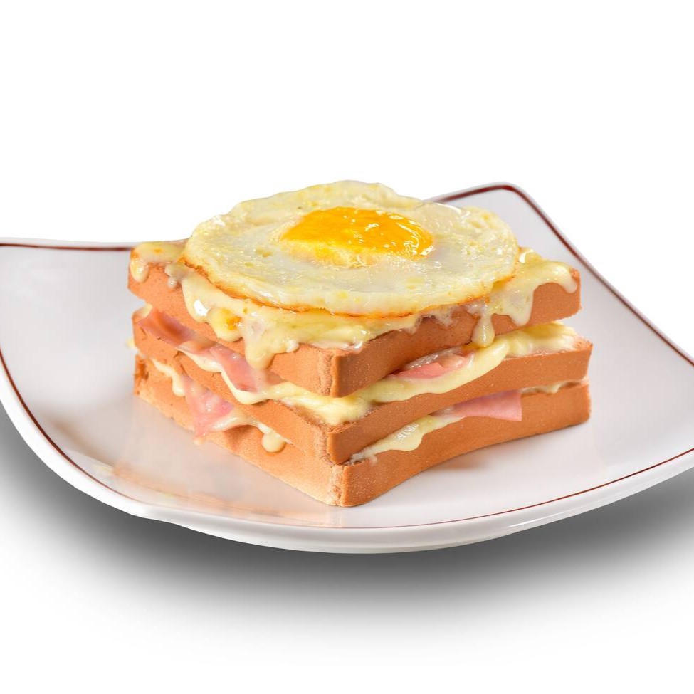 Pão de sanduíche intercalado com presunto e queijo asiago, gratinado com molho alfredo e coroado com um ovo frito na manteiga.