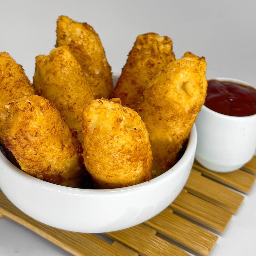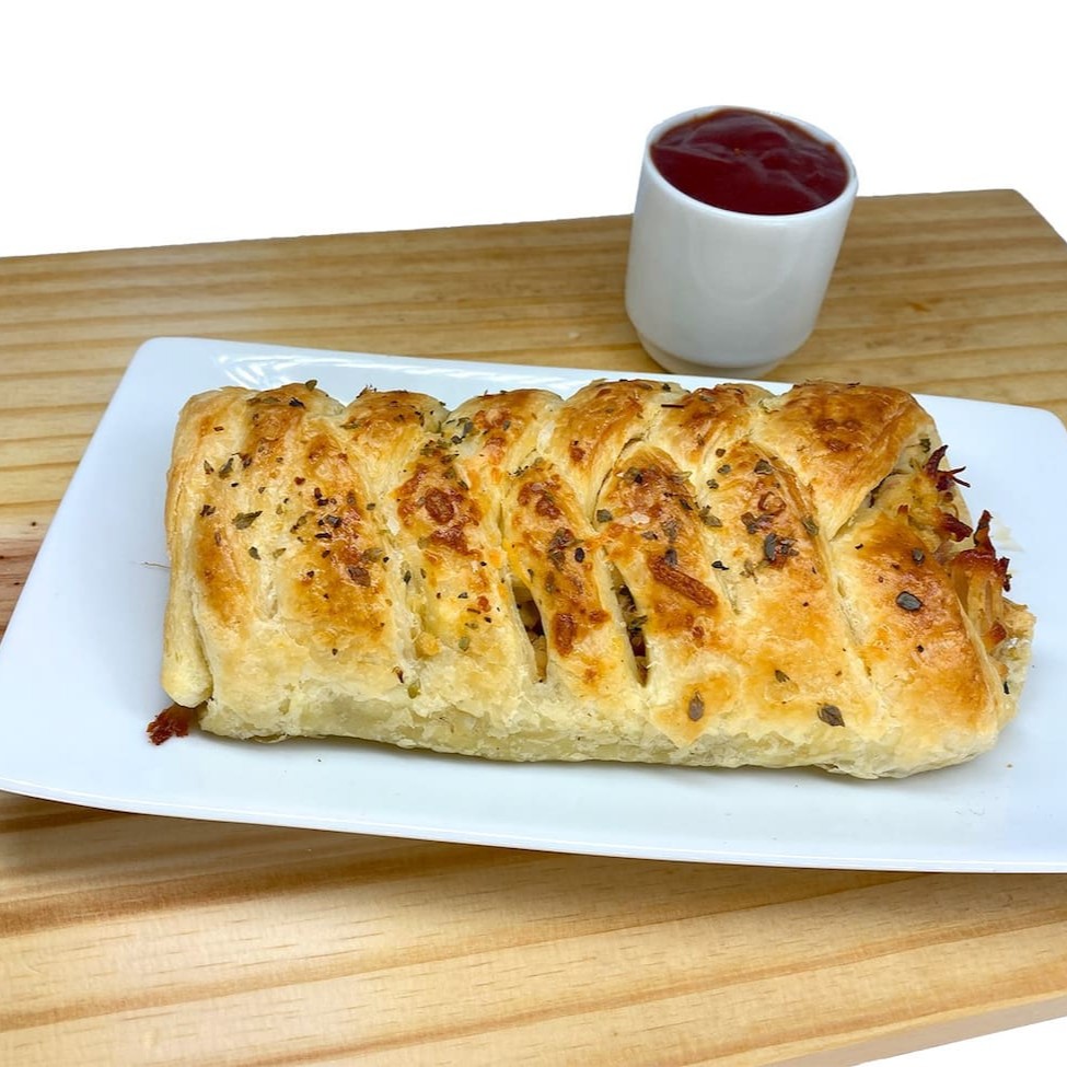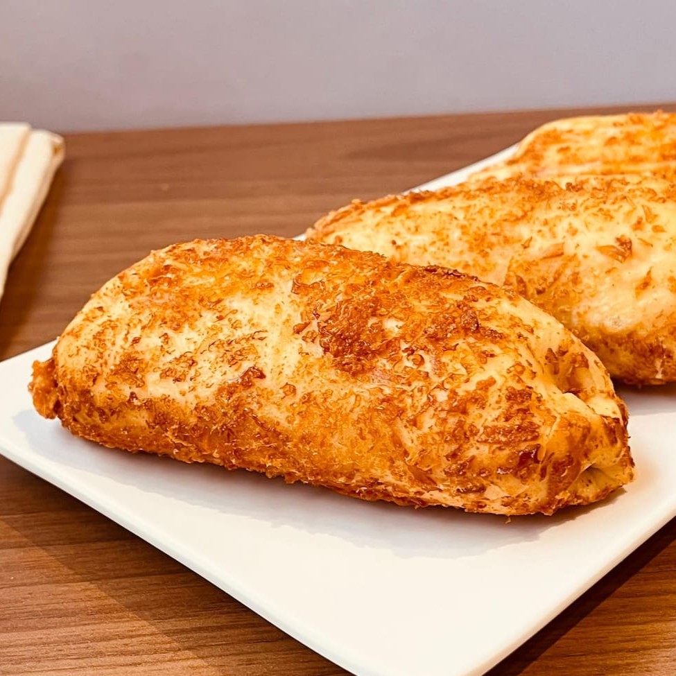 Massa especial com recheio de frango, cream cheese e queijo , envolta de queijo parmesão.