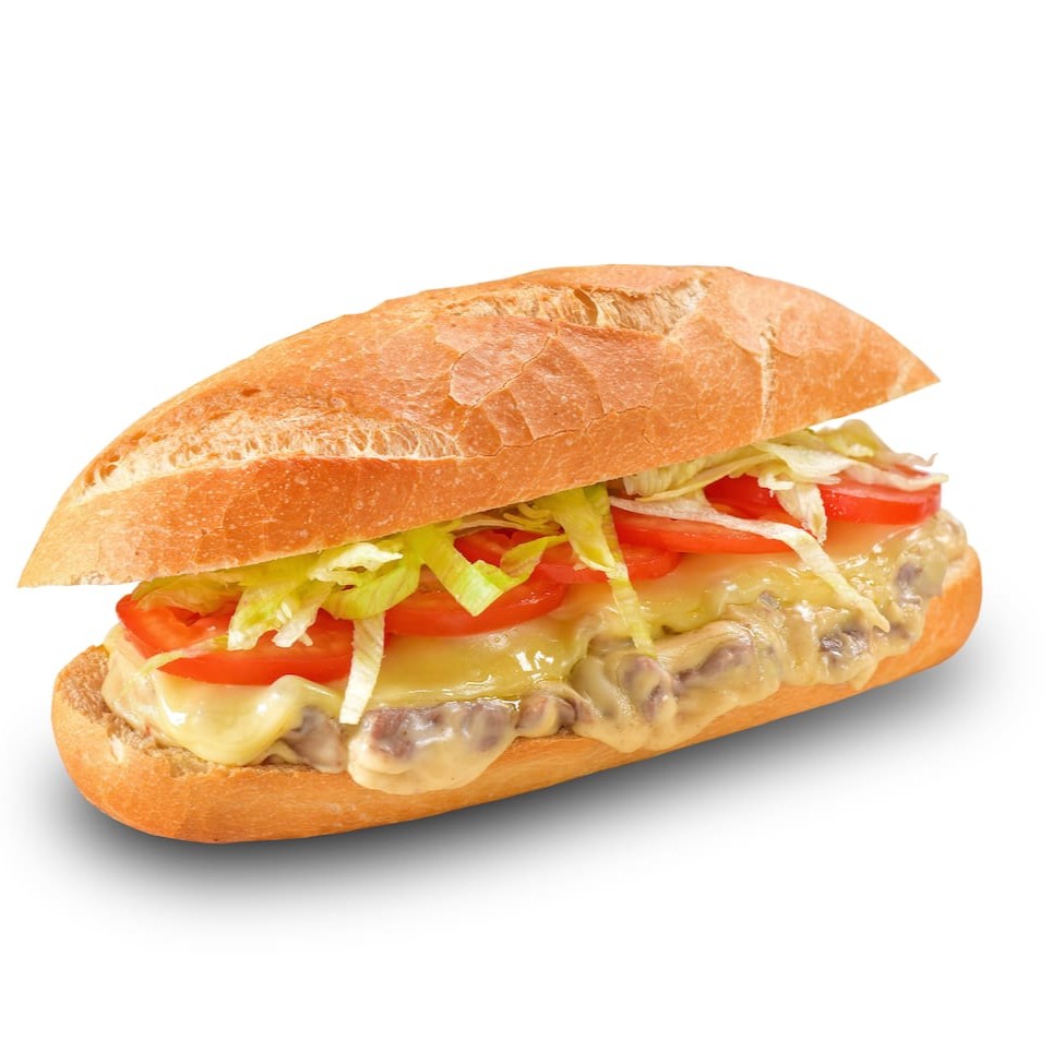 Pão baguete crocante, tirinhas de alcatra grelhadas com cogumelos Paris e molho alfredo, tomate em rodelas, muçarela e alface. Acompanha batata chips.