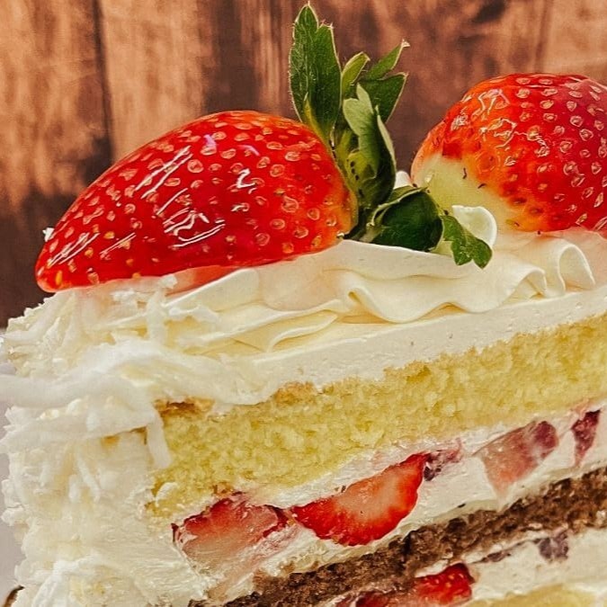Pão de ló de baunilha e chocolate, recheado com brigadeiro branco, Bettercreme sabor nata (tipo chantilly) e morangos picados, coberto com Bettercreme sabor nata, coco fresco e morango.