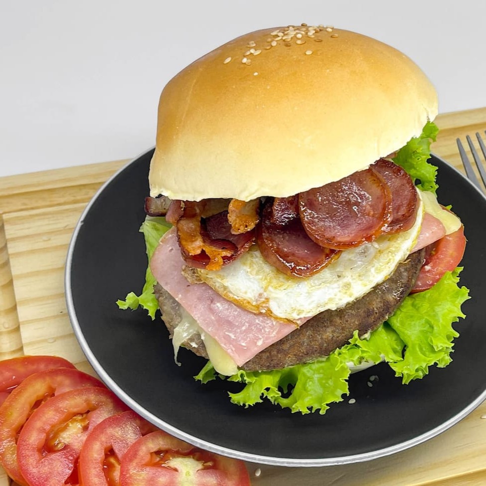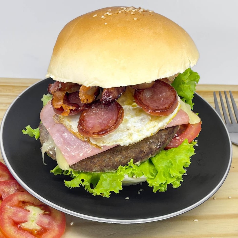 Pão de hambúrguer, maionese, hambúrguer, presunto, muçarela, ovo, calabresa, bacon, milho, alface e tomate.