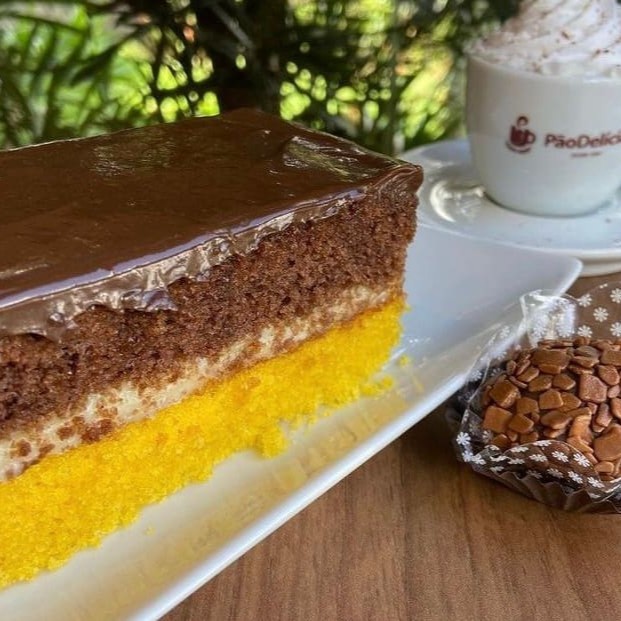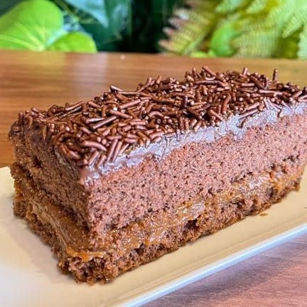 Massa de chocolate, umedecida com calda, recheada com creme de chocolate e creme de coco, finalizada com uma generosa cobertura de creme de chocolate. Uma combinação tropical e intensa que une o sabor marcante do chocolate ao toque suave do coco.