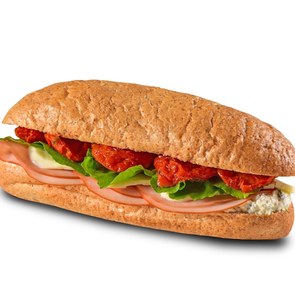 Pão baguete integral, pasta de ricota e ervas finas, fatias de peito de peru, queijo minas, tomate seco e rúcula. Acompanha batata chips.