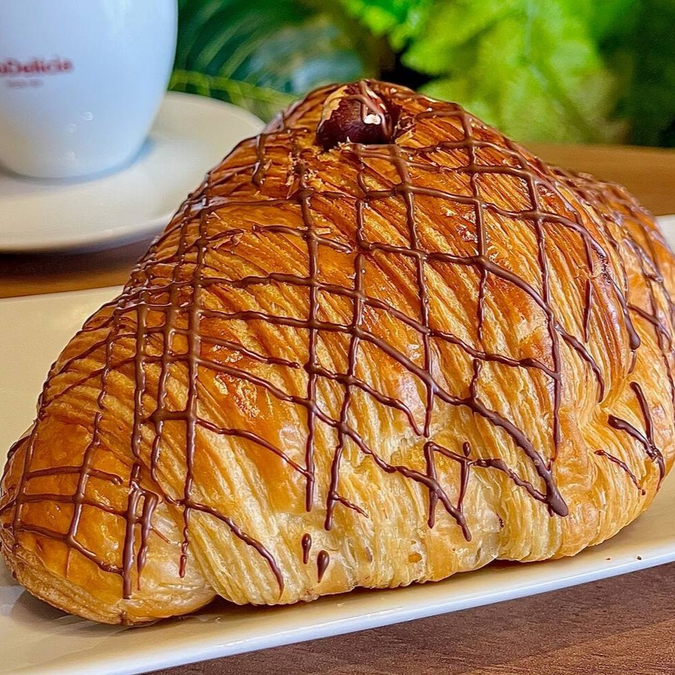 Massa semi folhada, com recheio de chocolate e coberto com chocolate meio amargo.