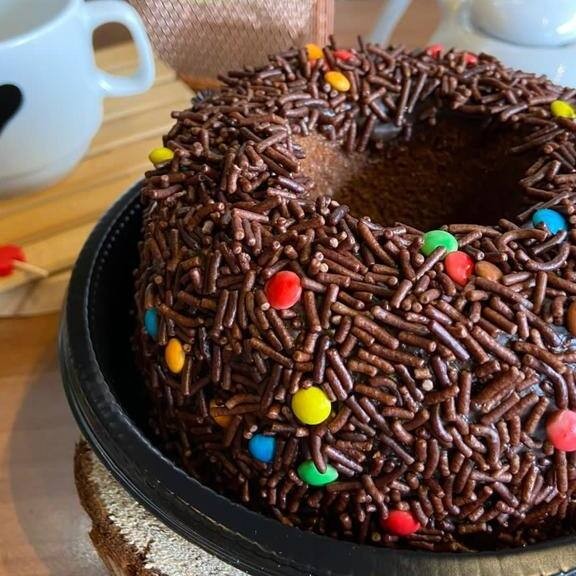 Massa de chocolate, recheado com doce de leite e coberto com chocolate granulado