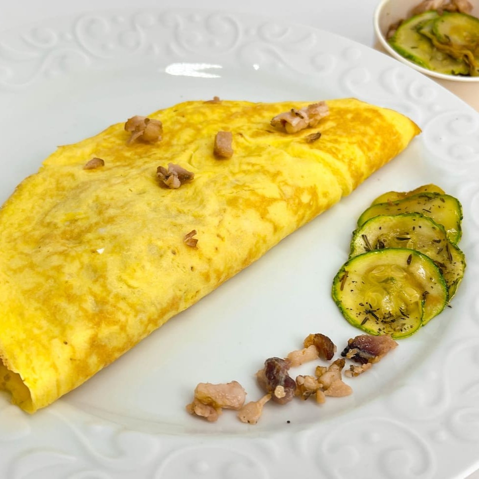 Bacon crocante, abobrinha grelhada e queijo muçarela.