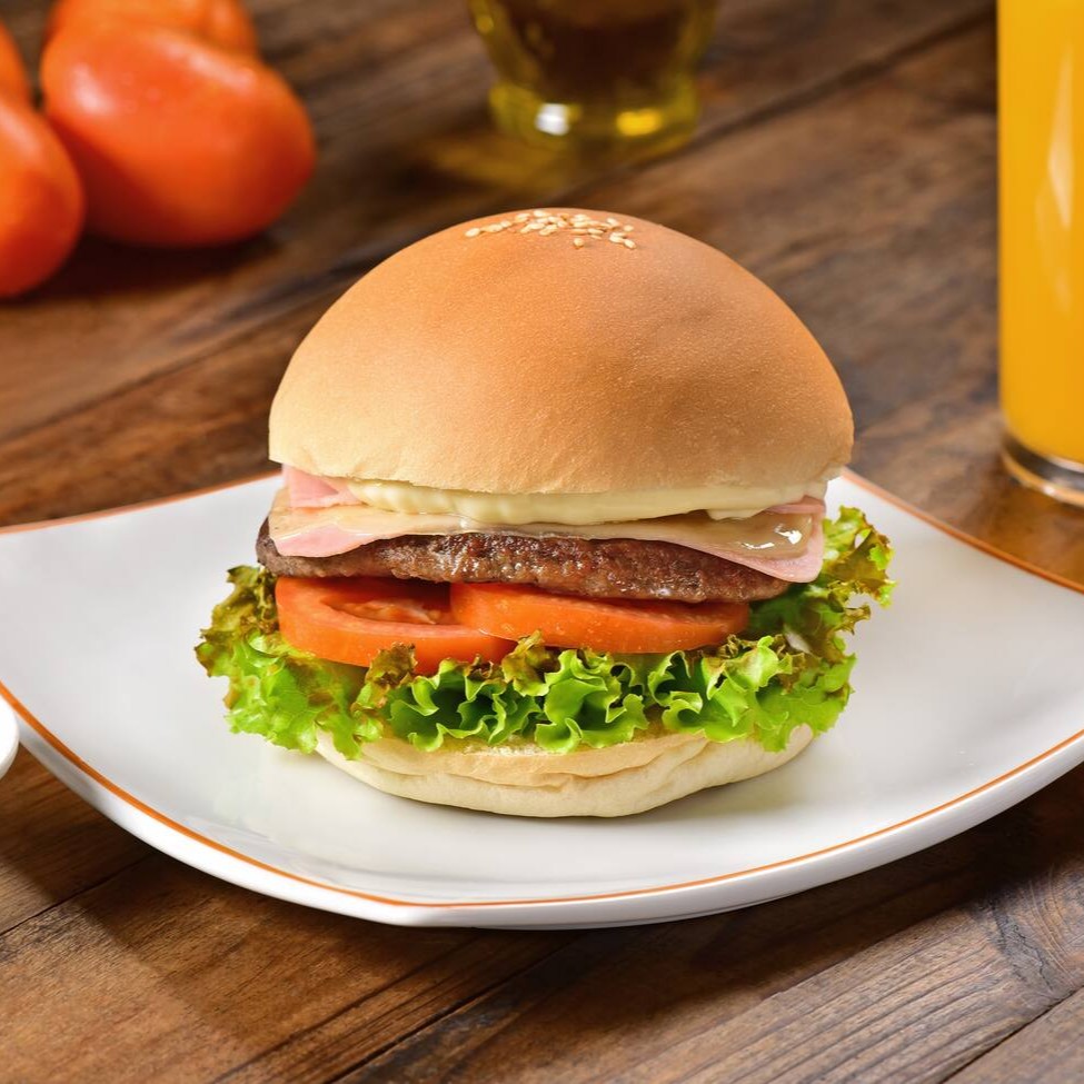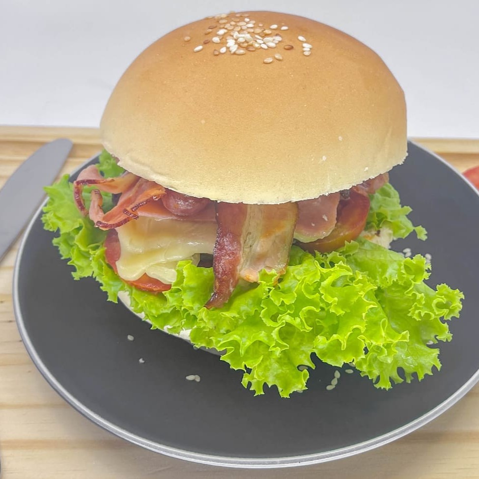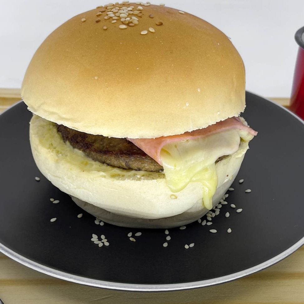 Pão de hambúrguer, maionese, hambúrguer, presunto e muçarela.