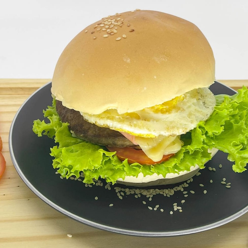 Pão de hambúrguer, maionese, hambúrguer, presunto, muçarela, ovo, alface e tomate.