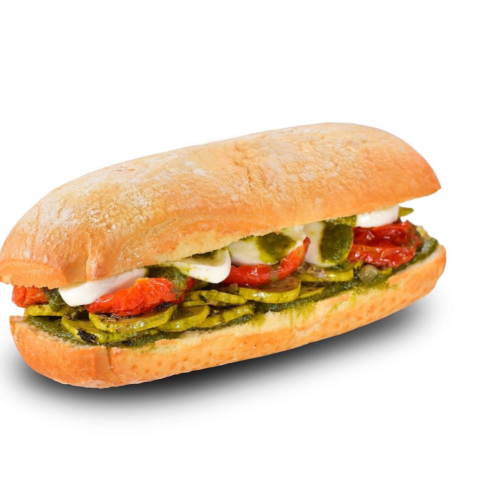 Baguete integral, molho pesto, fatias de abobrinha grelhadas ao azeite de oliva, tomates secos e queijo minas frescal. Acompanha batata chips.