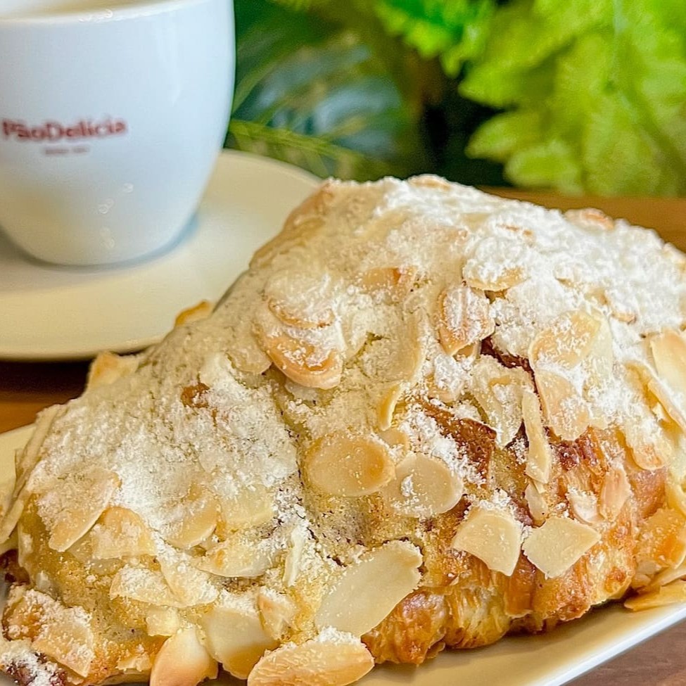 Croissant amanteigado, recheado com creme de amêndoas e coberto com amêndoas laminadas