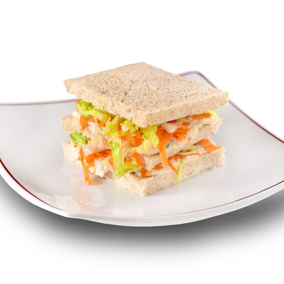 Pão integral, pasta de atum contendo; pepino picadinho, salsinha, parmesão e maionese, cenoura ralada e alface. Acompanha batata chips.