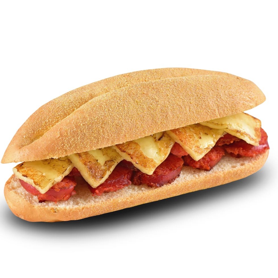 Baguete de milho, linguiça blumenau, queijo minas grelhado. Acompanha trio de pastas : maionese de mostarda, cebolas caramelizadas ao balsâmico e molho tártaro.