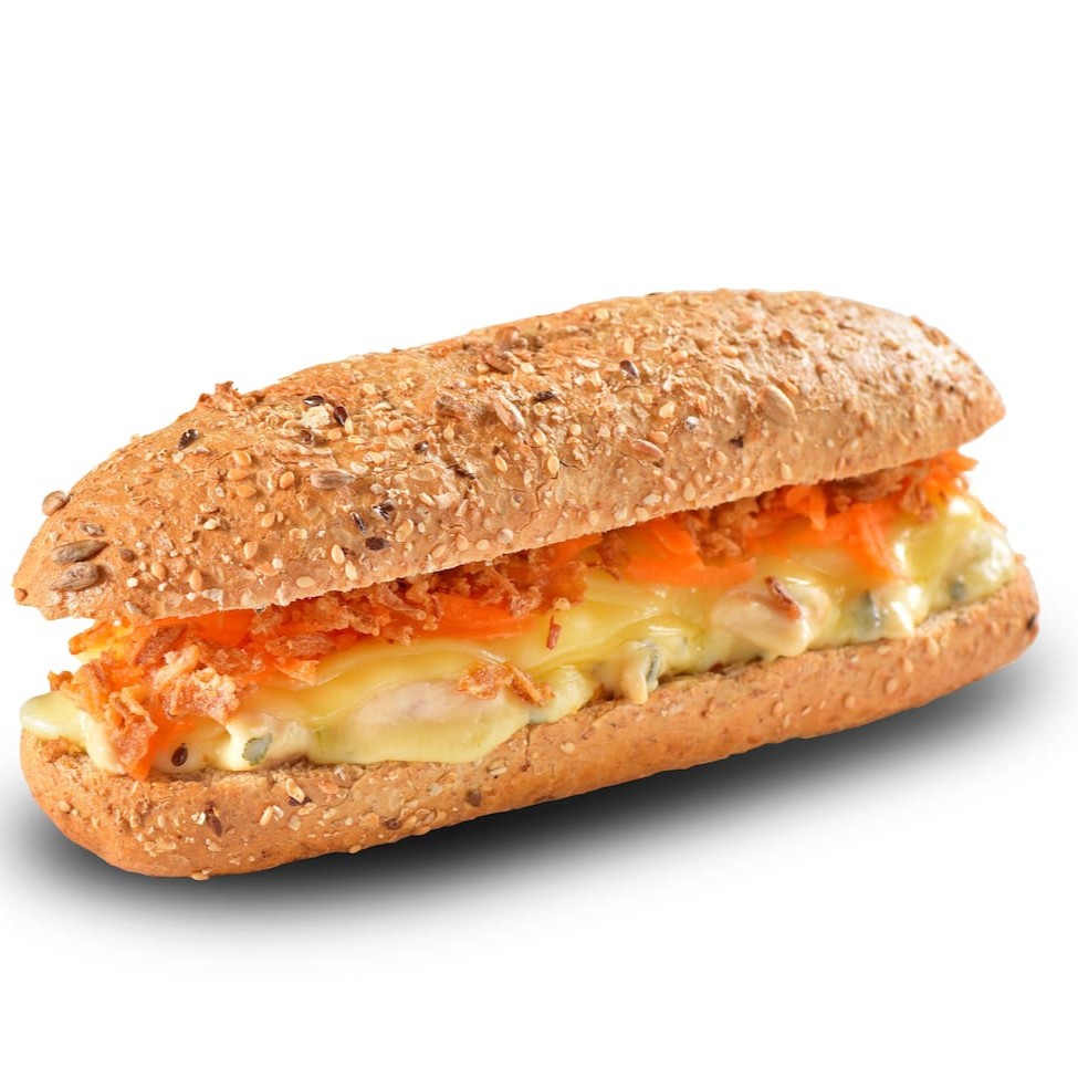 Pão multigrãos, tirinhas de frango grelhadas com sálvia e molho alfredo, queijo muçarela, cenoura ralada e cebola crispy. Acompanha batata chips.