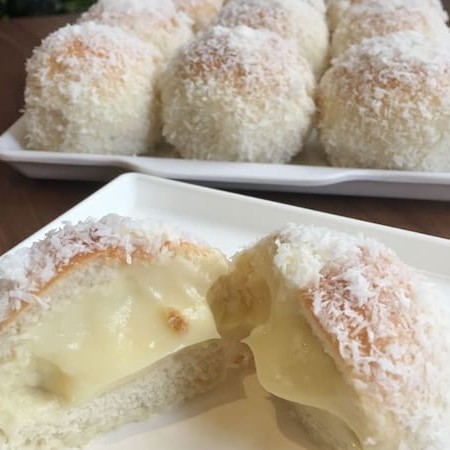 Massa doce recheada com creme lua de mel, coberta com leite condensado e côco